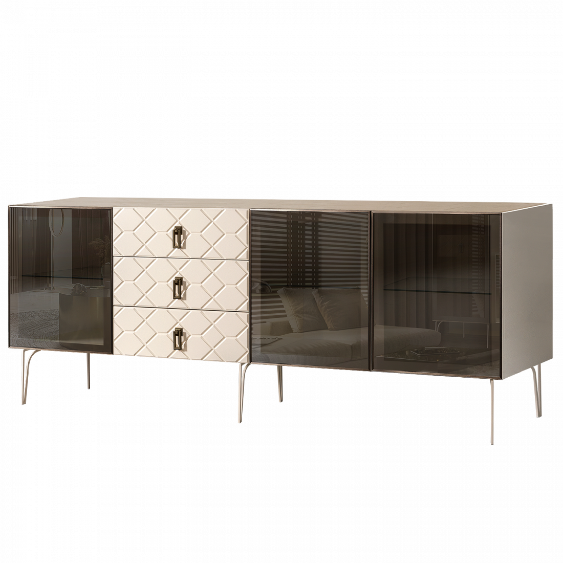 Стекло Stopsol меняет свои отражающие свойства под воздействием источников света. Поверхность, отражающая свет, мягко скроет содержимое вашего комода или витрины.