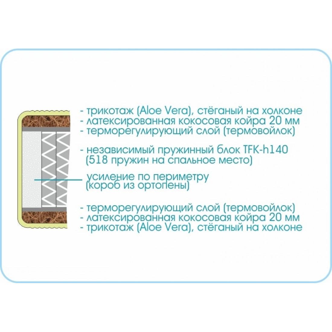 Наполнение: независимый блок TFK, высота блока 140 мм, ортопена 15 мм с двух сторон, кокосовая плита 10 мм с 1-ой стороны, износостойкий спанбонд с 2-х сторон, усиление по периметру - короб из ортопены.