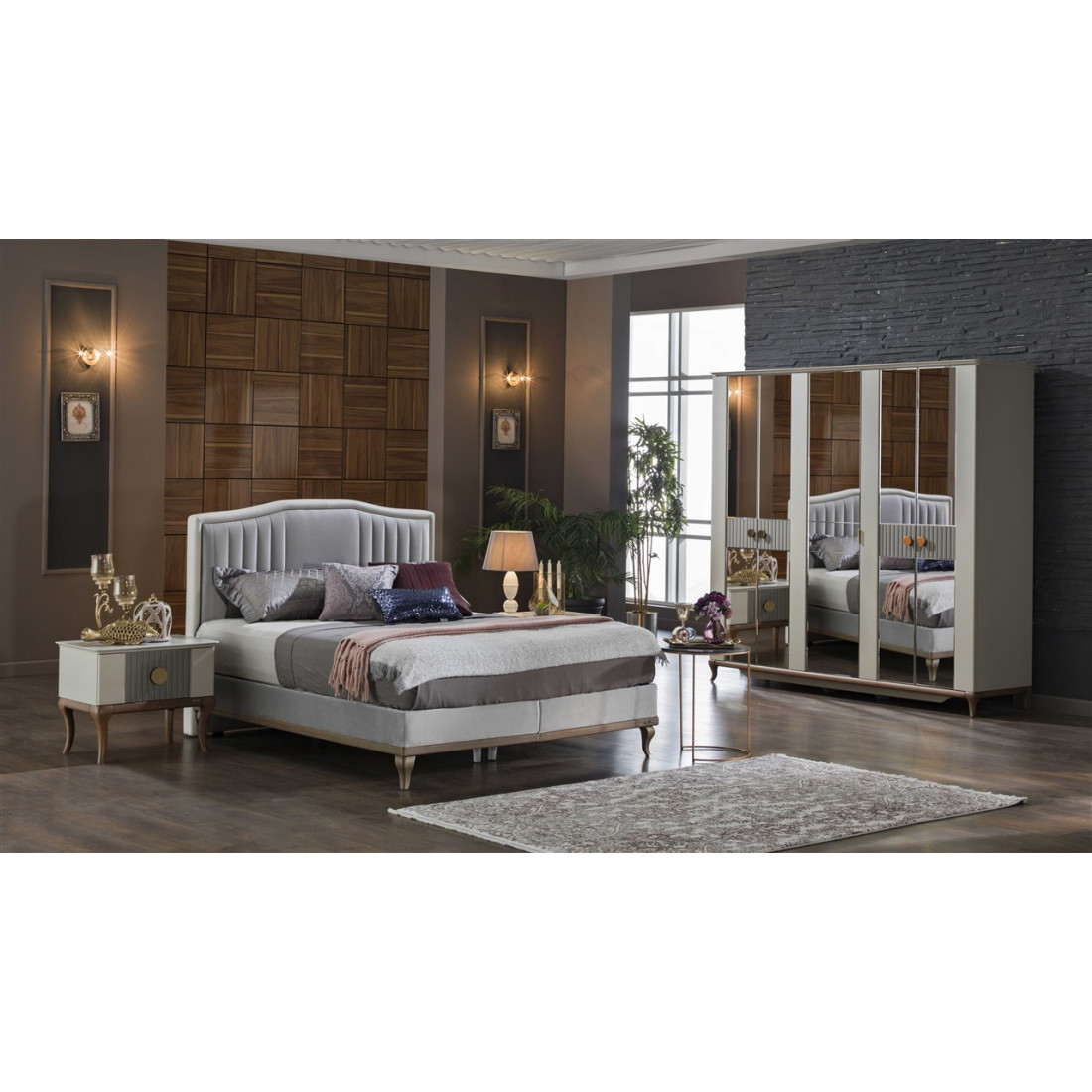 Шкаф платяной 5-дверный серии Pesaro Bellona. Изготовлен из высококачественного ЛДСП производства Турция, класс эмиссии формальдегидов Е1. Зеркальная дверь в центре с прямоугольной ручкой, двери справа и слева со вставками серого цвета и большими круглыми ручками под бронзу. Ножки и рамка из натурального дерева с оттенком медовый орех. Размеры и наполнение шкафа позволит аккуратно разместить большое количество вещей. Двери и ящики с доводчиками, обеспечивающими плавный ход и безопасность.