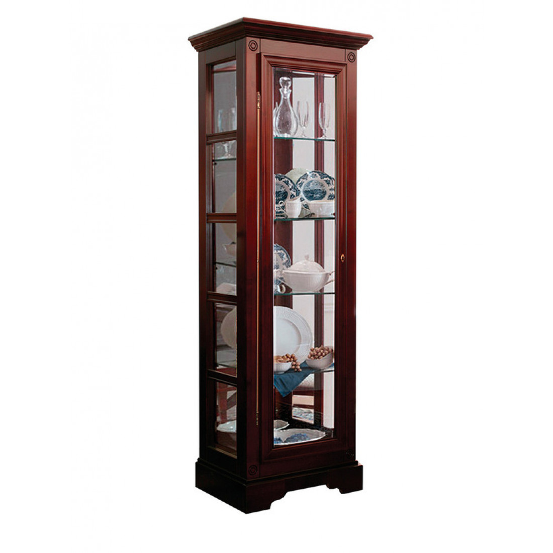 Узкий витринный шкаф «Полонез» ММ-174-05 из натурального массива бука сочетает в себе лаконичный дизайн, строгие линии, обилие света и стекол. Данная модель имеет экологически чистое покрытие (применяются пропитки и лаки на водной основе); окрашена в красивый бархатный цвет «черешня»; оснащена фасадной и боковыми стенками из стекла; укомплектована стеклянными полками; дополнена задней зеркальной стенкой; имеет внутреннюю подсветку.