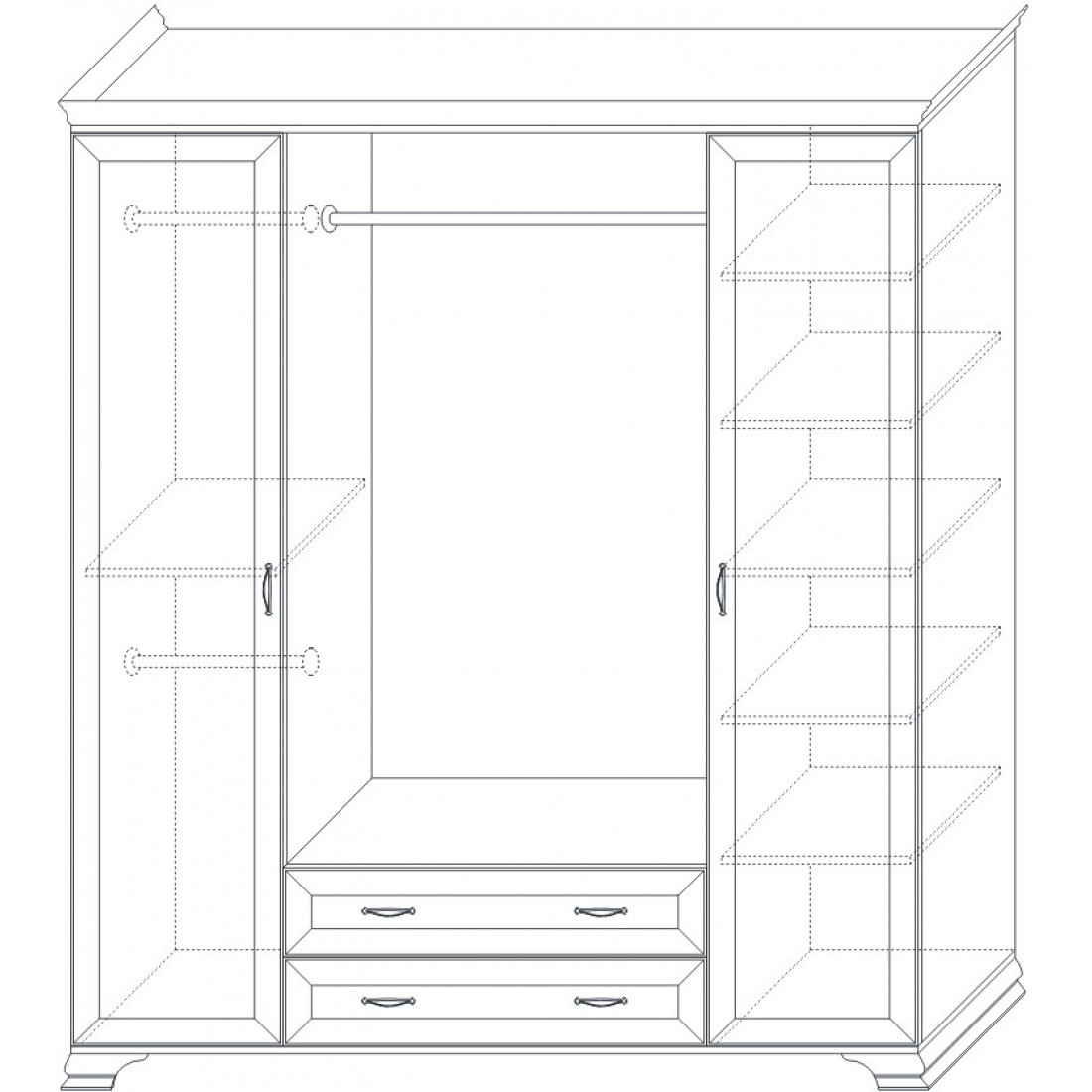 4-х дверный шкаф из коллекции для спальни «Сиена» подставляется в комплекте с боковыми фасадами, центральные двери (на выбор - зеркальные или глухие) поставляются отдельно от шкафа.